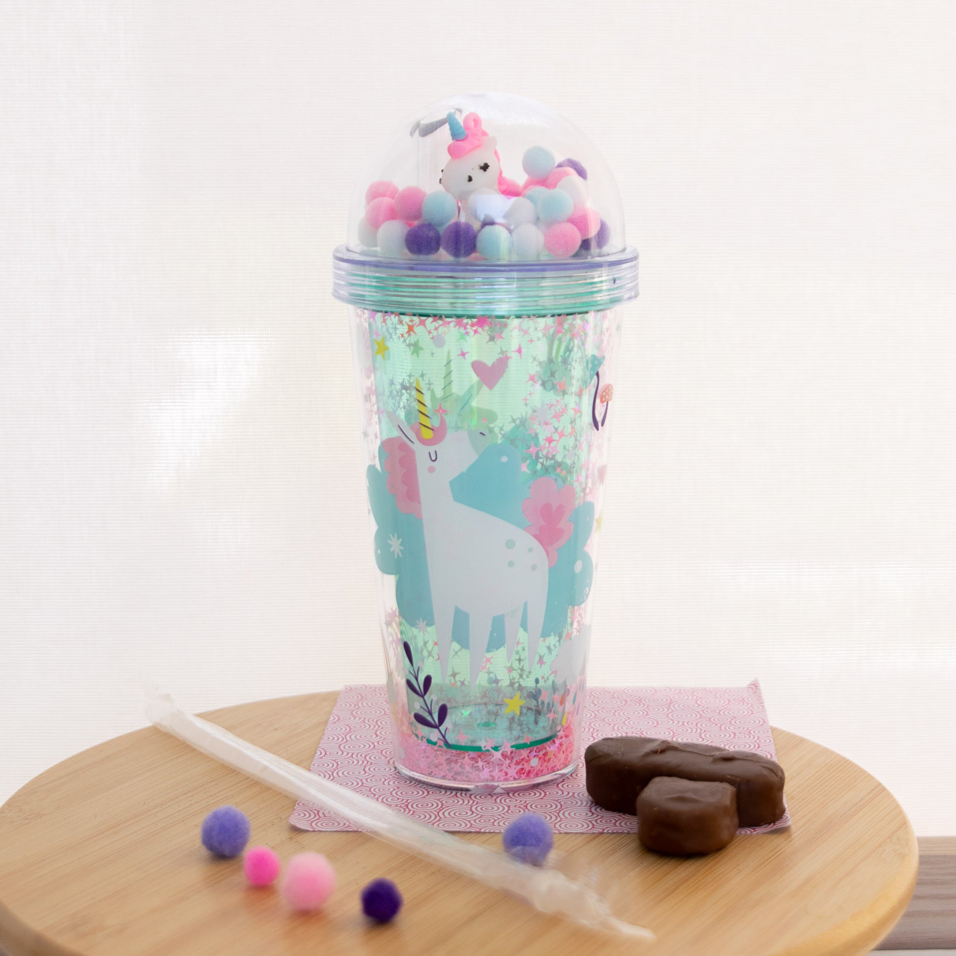 - Paille intégrée et pompons licorne trop adorables